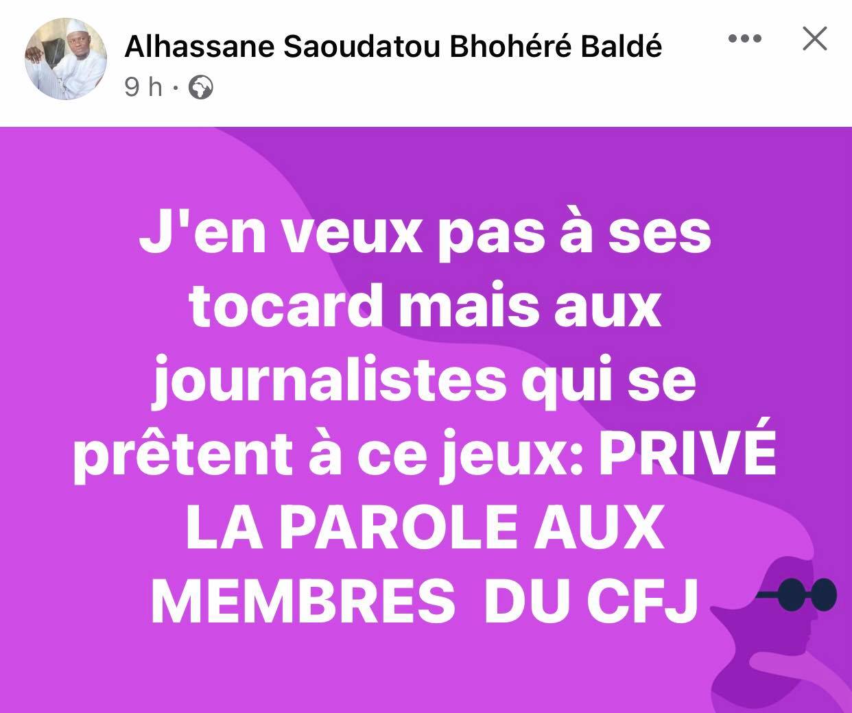 Alhassane Saoudatou Bhohere Baldé : « Je n’en veux pas à ces tocards mais à ces journalistes qui se prêtent à ce jeu. PRIVÉ LA PAROLE AUX MEMBRES DU CFJ. »