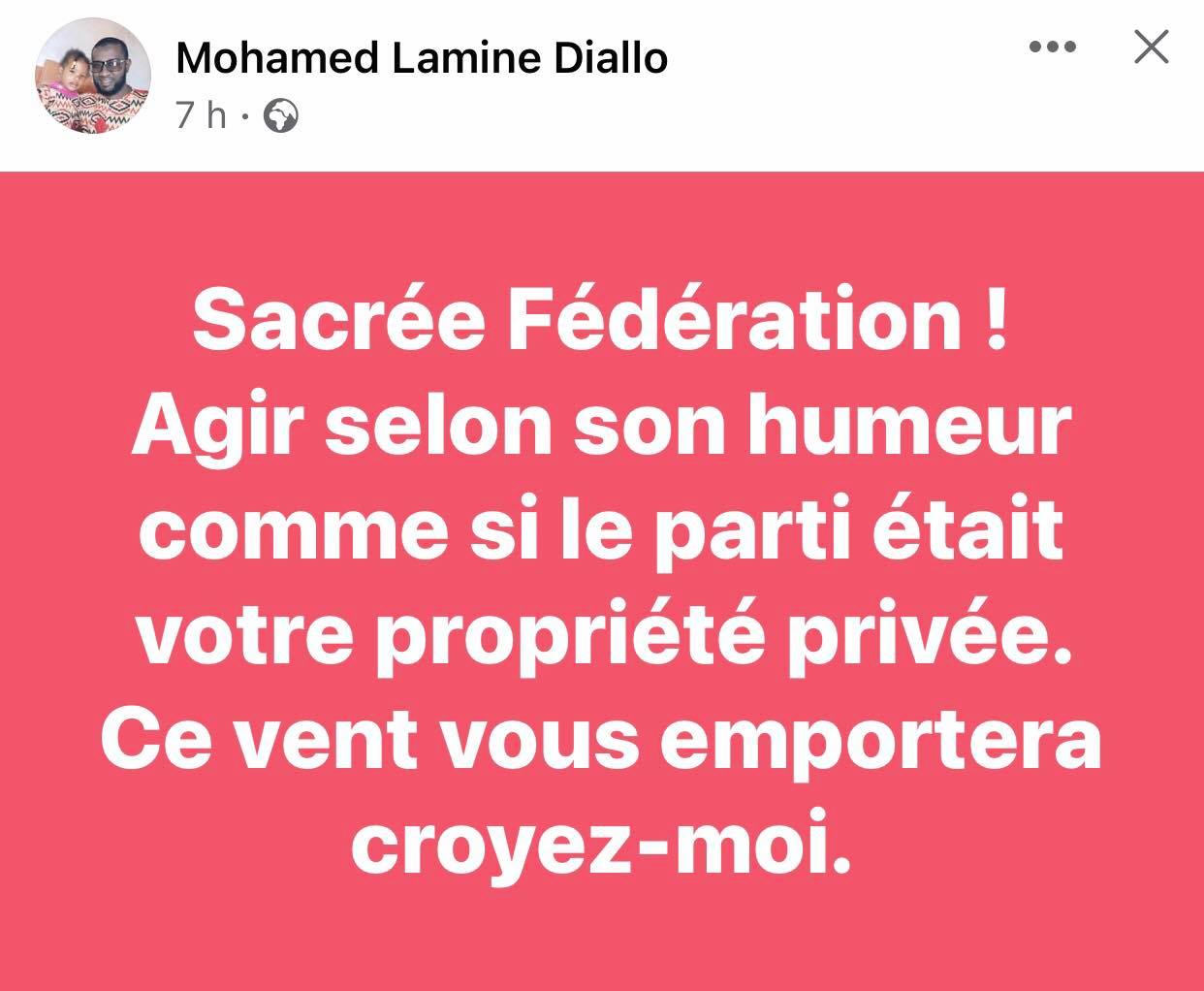 Mohamed Lamine Diallo : « Sacrée fédération ! Agir selon son humeur comme si le parti était votre propriété privée. Ce vent vous emportera croyez-moi. »