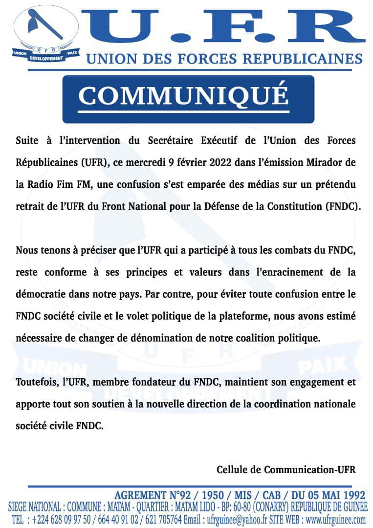 Depuis la désignation de Foniké Manguè à la tête du FNDC, des courants se sont créés au sein du mouvement. Certains dénoncent la méthode de désignation de Foniké et exigent du coordinateur sortant, Abdourahmane Sanoh, des comptes. D’autres par contre soutiennent le changement intervenu à la tête du Front national de défense de la constitution. C’est le cas de l’UFR de Sidya Touré. Ci-dessous sa déclaration.