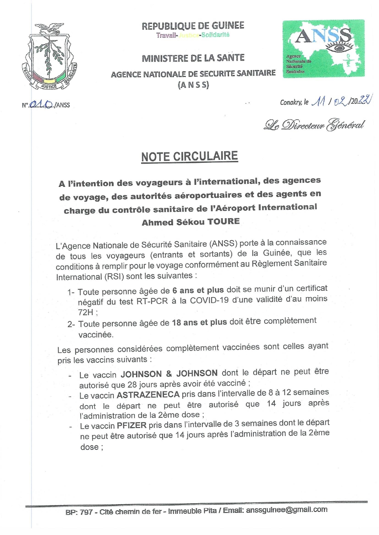 L’Agence nationale de sécurité sanitaire (ANSS) a dans une note circulaire annoncé de nouvelles mesures à l’attention des voyageurs à l’international, des agences de viyage, des autorités aéroportuaires et des agents en charge du contrôle sanitaire de l’Aéroport international Ahmed Sékou Touré