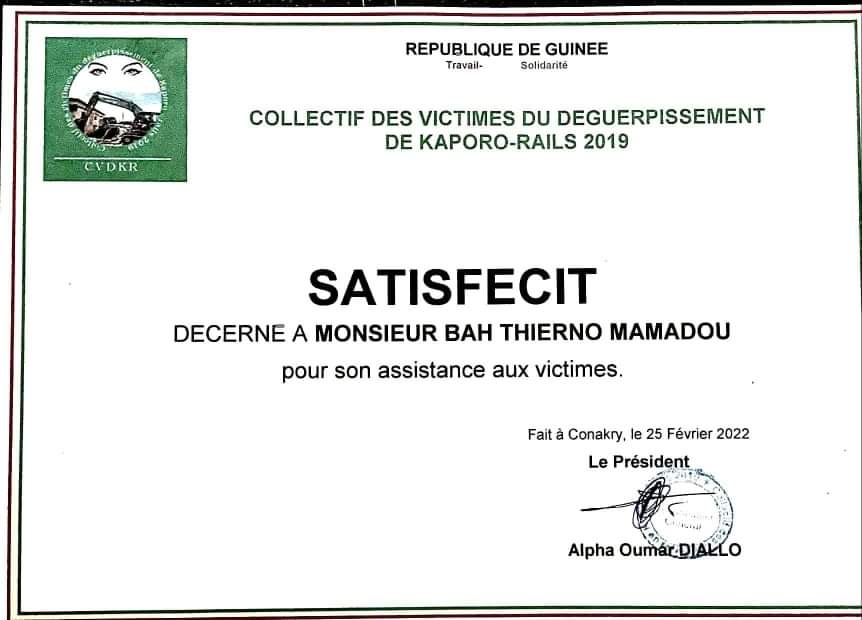 Le samedi dernier, le collectif des victimes du déguerpissent de Kaporo-rails a décerné un satisfecit à Thierno Mamadou BAH -TMB- Conseiller du Président de la Transition pour services rendus aux déguerpis en 2019.