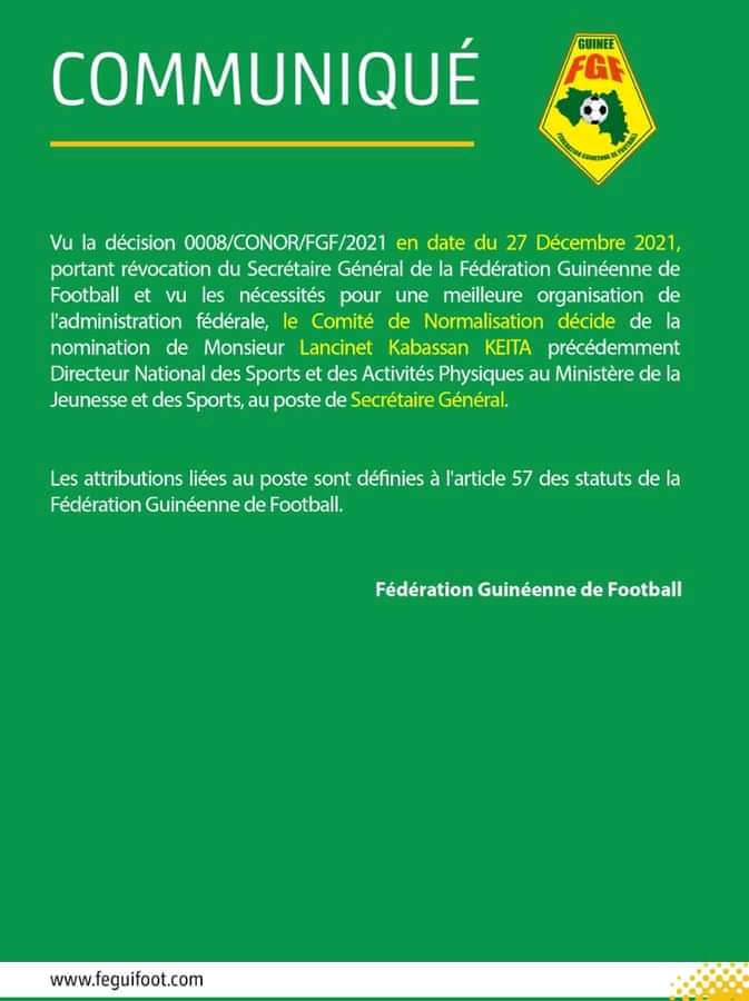 CONAKRY- Vacant jusqu’à ce jour, le poste de Secrétaire Général de la Fédération Guinéenne de Football trouve désormais preneur.