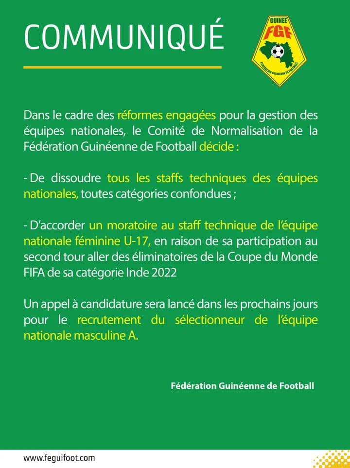 Conakry- Dans un communiqué rendu public ce vendredi, le Comité de Normalisation de la fédération guinéenne de Football annonce la dissolution de tous les staffs techniques de toutes les équipes nationales de Guinée.