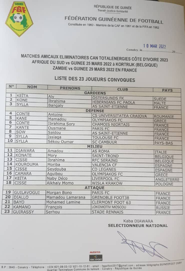 Dans la matinée du jeudi 10 mars 2022, le sélectionneur du Syli national, KABA Diawara a, à travers une conférence de presse, publié la liste des 23 joueurs convoqués pour les deux prochaines journées FIFA, contre l’Afrique du Sud, le 25 mars en Belgique et contre la Zambie le 29 mars 2022. Sur cette liste, on note la première du Rennais Serhou GUIRASSY après tant de convoitise.