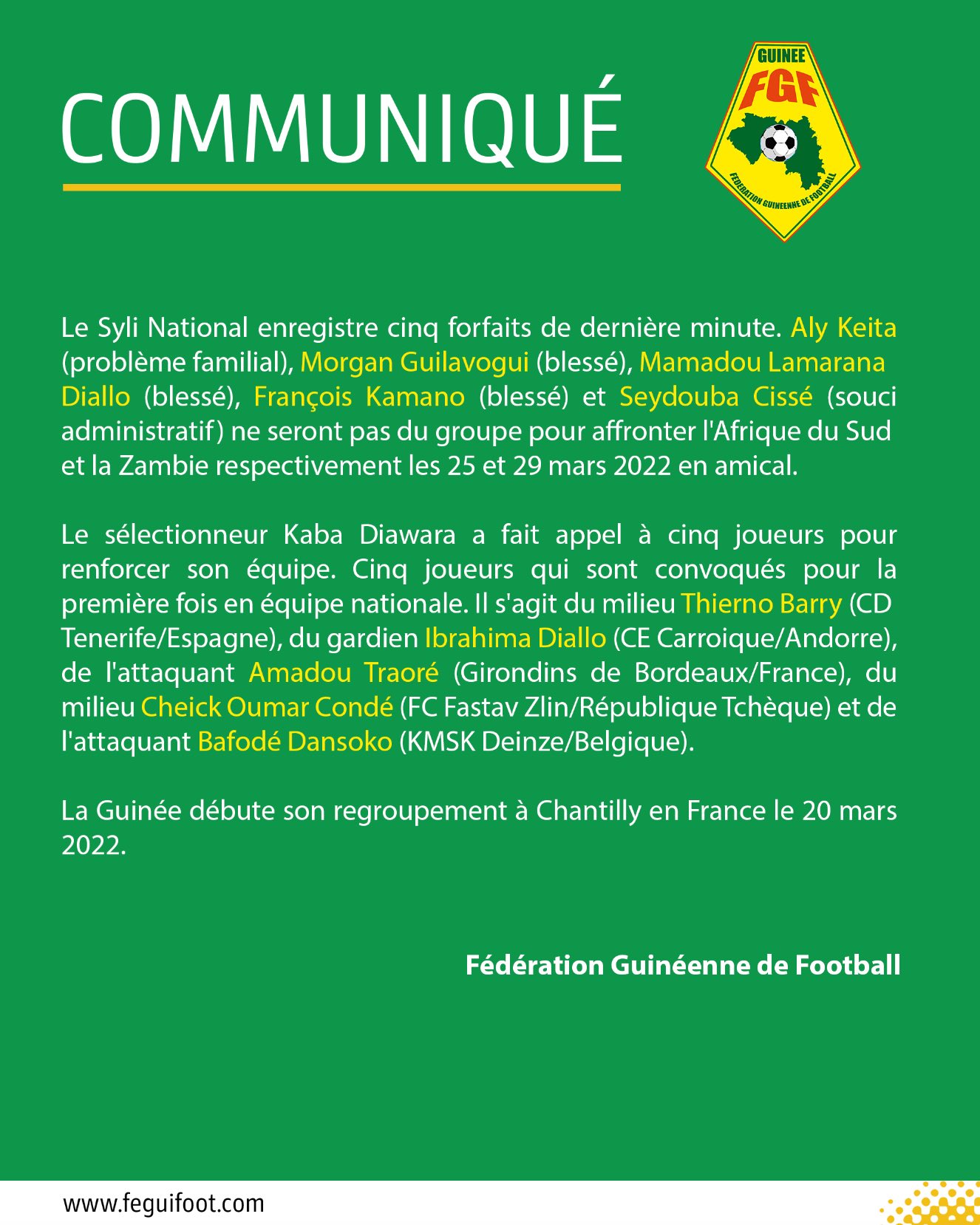 CONAKRY- La Guinée devra faire sans 5 des 23 joueurs préalablement convoqués par le sélectionneur Kaba Diawara, à l’occasion de la trêve internationale de ce mois de mars contre l’Afrique du Sud et la Zambie. En effet, cinq (5) joueurs sont obligés de déclarer forfaits.