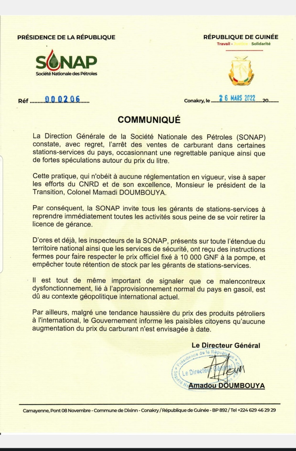 Dans un communiqué dont copie a été transmise à guinee7.com, le directeur général de la Société nationale des pétroles (SONAP) Amadou Doumbouya a indiqué qu’aucune augmentation du prix du carburant n’est envisagée à date.