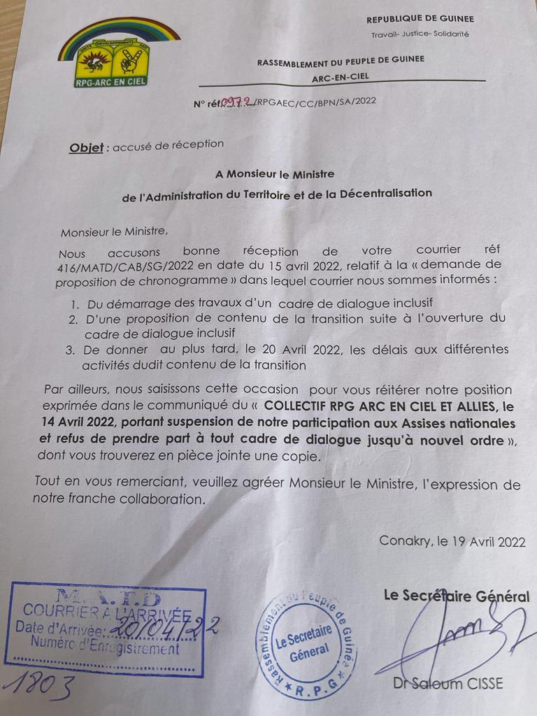 Lire ci-dessous la réponse du RPG AEC et alliés au courrier de Mory Condé, ministre de l’Administration du Territoire.