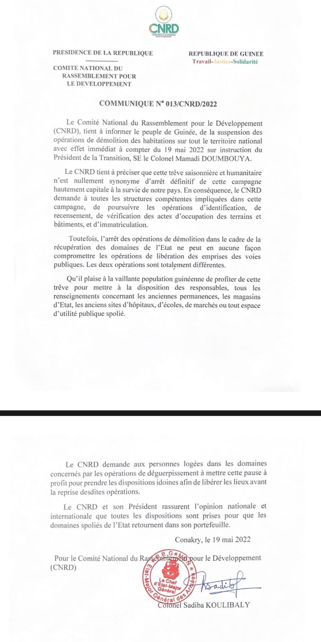 L’article Le CNRD suspend les opérations de démolition des bâtiments est apparu en premier sur Guinee7.com.