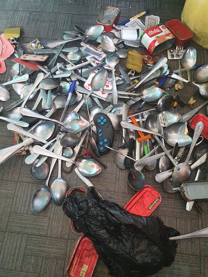 Ce Jeudi à l’occasion d’un contrôle qu’il a effectué à la maison centrale de Conakry, le procureur général près la cour d’appel de Conakry, Alphonse Charles Wright a annoncé qu’une fouille systématique sera effectuée dans toutes les maisons d’arrêt du ressort de la cour d’appel de Conakry. C’est dans cette optique, que le tribunal de première instance de Labé a réquisitionné des gendarmes et policiers pour exécuter la décision. Après une fouille qui a duré près de 3 heures, ce sont 10 téléphones portables, des cuillères, des lames et des clous qui ont été retrouvés. « Nous avons organisé cette fouille, dans le cadre de ce que le procureur général près la cour d’appel de Conakry a initié. Comme il l’a dit, et c’est un constat réel, en période hivernale, il y a un risque d’évasions, parce que quand il y a des pluies diluviennes, ce sont ces moments où les détenus profitent pour enlever les tôles, percer les murs et s’en aller et donc, il est nécessaire pour nous de pouvoir fouiller toutes les cales, voir est ce qu’il n’y a pas d’instruments qui puissent aider les détenus à s’évader. Heureusement pour nous, au niveau de la prison de Labé, je peux dire qu’il n’y a pas péril en la demeure. Nous avons procédé à cette fouille, rien de grave n’a été retrouvé, seulement une dizaine de téléphones, cinq chargeurs, des cuillères que nous estimons que les détenus utilisent pour manger et des lames qu’il faut craindre », a expliqué à la sortie de la fouille, Pierre Kolié, substitut du procureur de la République, près le tribunal de première instance de Labé.