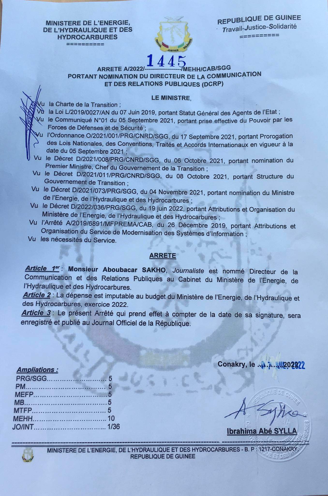 A travers un arrêté ministériel, le journaliste Aboubacar Sakho a été nommé au poste de directeur de la communication et des relations publiques au cabinet du Ministère de l’Energie, de l’Hydraulique et des Hydrocarbures.