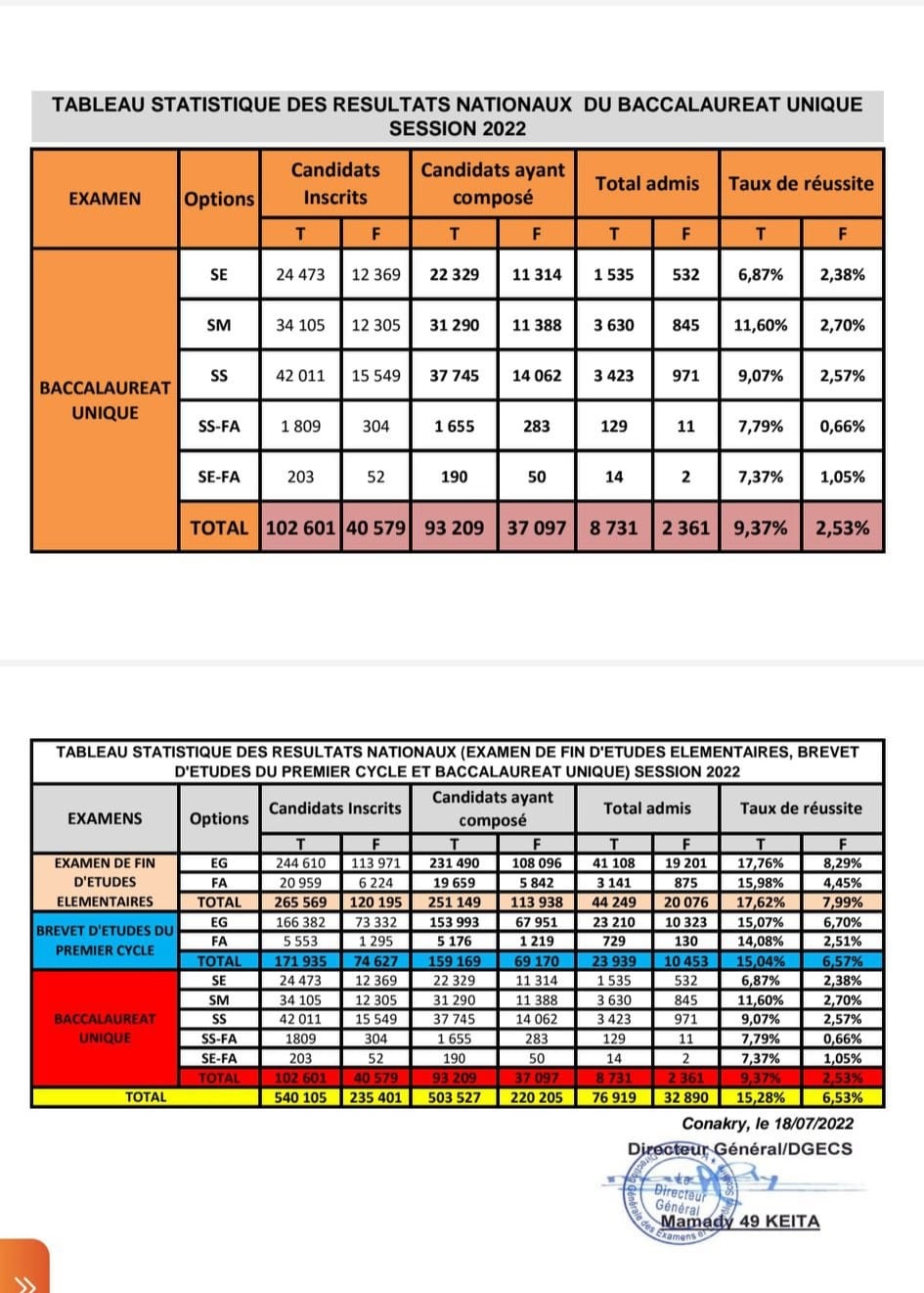 En voyant les résultats de ces trois examens nationaux, nous n’avions que deux choix : faire un repêchage et continuer ainsi la politique de l’autruche ou dire la vérité au peuple de Guinée. Si le premier choix nous est avantageux en tant que gouvernants, le second est sans nul doute le plus bénéfique pour le futur du peuple de Guinée. C’est pourquoi, le Cabinet du Ministère de l’Enseignement Pré-Universitaire et de l’Alphabétisation dont j’ai l’insigne honneur de diriger a choisi de dire la vérité, toute la vérité, rien que la vérité au vaillant peuple de Guinée. Tel est le prix à payer, le sacrifice douloureux à consentir pour réussir la refondation de notre système éducatif qui, nous ne le dirons jamais assez, est le principal pilier de la refondation de l’Etat, prônée depuis le 05 Septembre 2021 par le CNRD et son Président, Son Excellence Colonel Mamadi DOUMBOUYA, Président de la Transition, Chef de l’Etat, Chef Suprême des Armées.