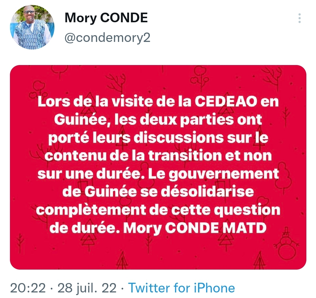 « Lors de la visite de la CEDEAO en Guinée, les deux parties ont porté leurs discussions sur le contenu de la transition et non sur une durée. Le gouvernement de Guinée se désolidarise complètement de cette question de durée », a informé le ministre guinéen, donné très proche du président de la transition Mamadi Doumbouya.