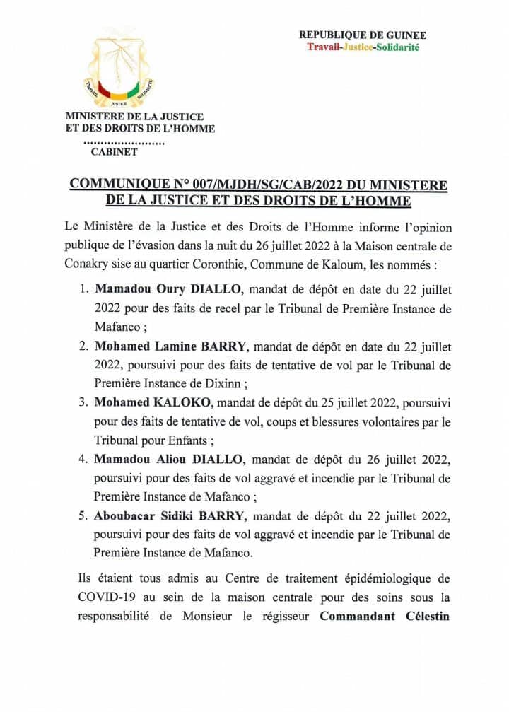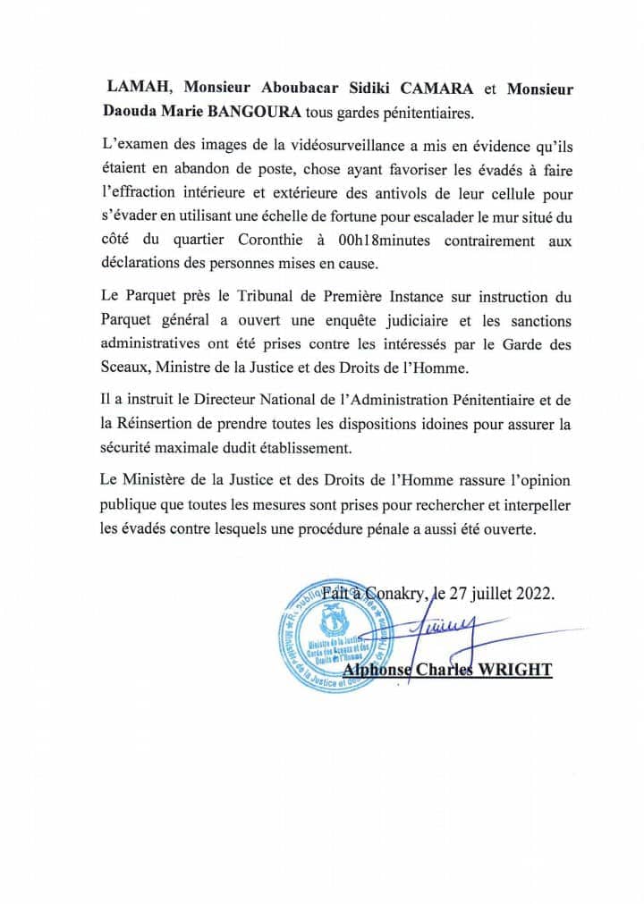Dans un communiqué que nous publions en bas, le ministre de la Justice, garde des sceaux, Alphonse Charles Wright, a informé de l’évasion de 5 détenus de la maison centrale de Coronthie à Conakry la nuit du 26 juillet.