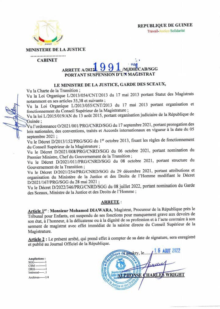 Après avoir répondu à une sortie de l’Association des magistrats, qui a dénoncé l’une de ses sorties contre le président du tribunal du Commerce, le ministre de la Justice, Garde des Sceaux, Alphonse Charles Wright, a suspendu Mohamed Diawara, procureur de la République près le tribunal pour enfants « pour manquement grave au devoir de son état ».