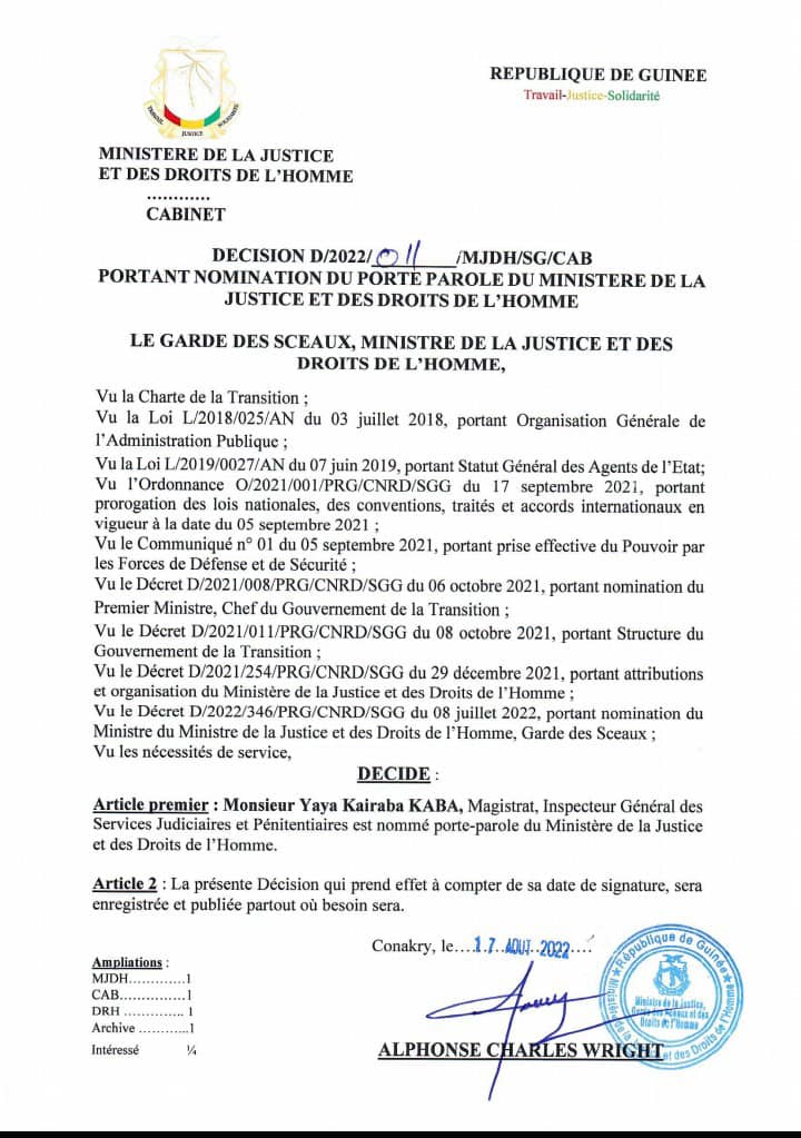 Le Ministère de la Justice a désormais un porte-parole. Son nom, Yaya Kairaba Kaba, magistrat, inspecteur général des services judiciaires et pénitentiaires est nommé porte-parole du Ministère de la Justice et des Droits de l’Homme.