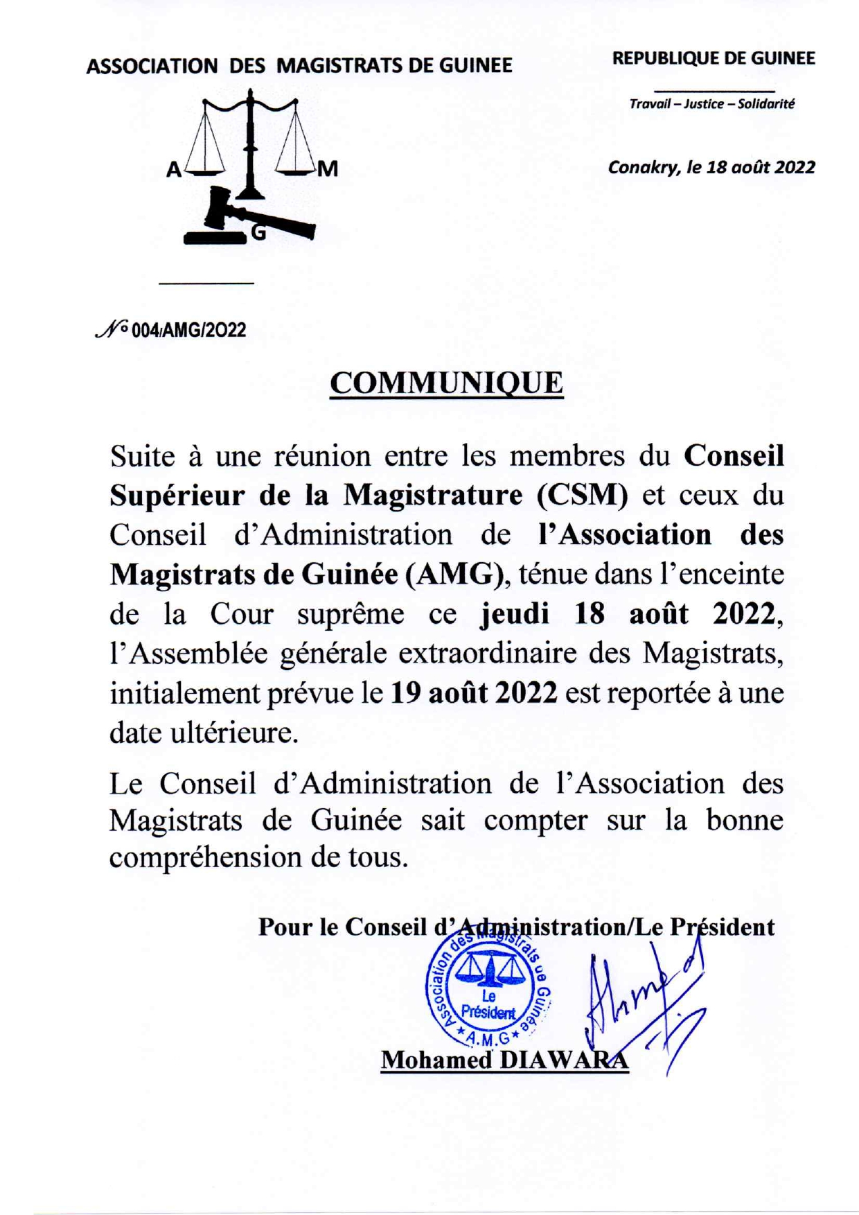 L’Assemblée générale extraordinaire des Magistrats initialement prévue ce vendredi est reportée à une date ultérieure. La décision fait suite à une rencontre entre le Conseil Supérieur de la Magistrature (CSM) et ceux du Conseil d’Administration de l’Association des Magistrats de Guinée (AMG)…