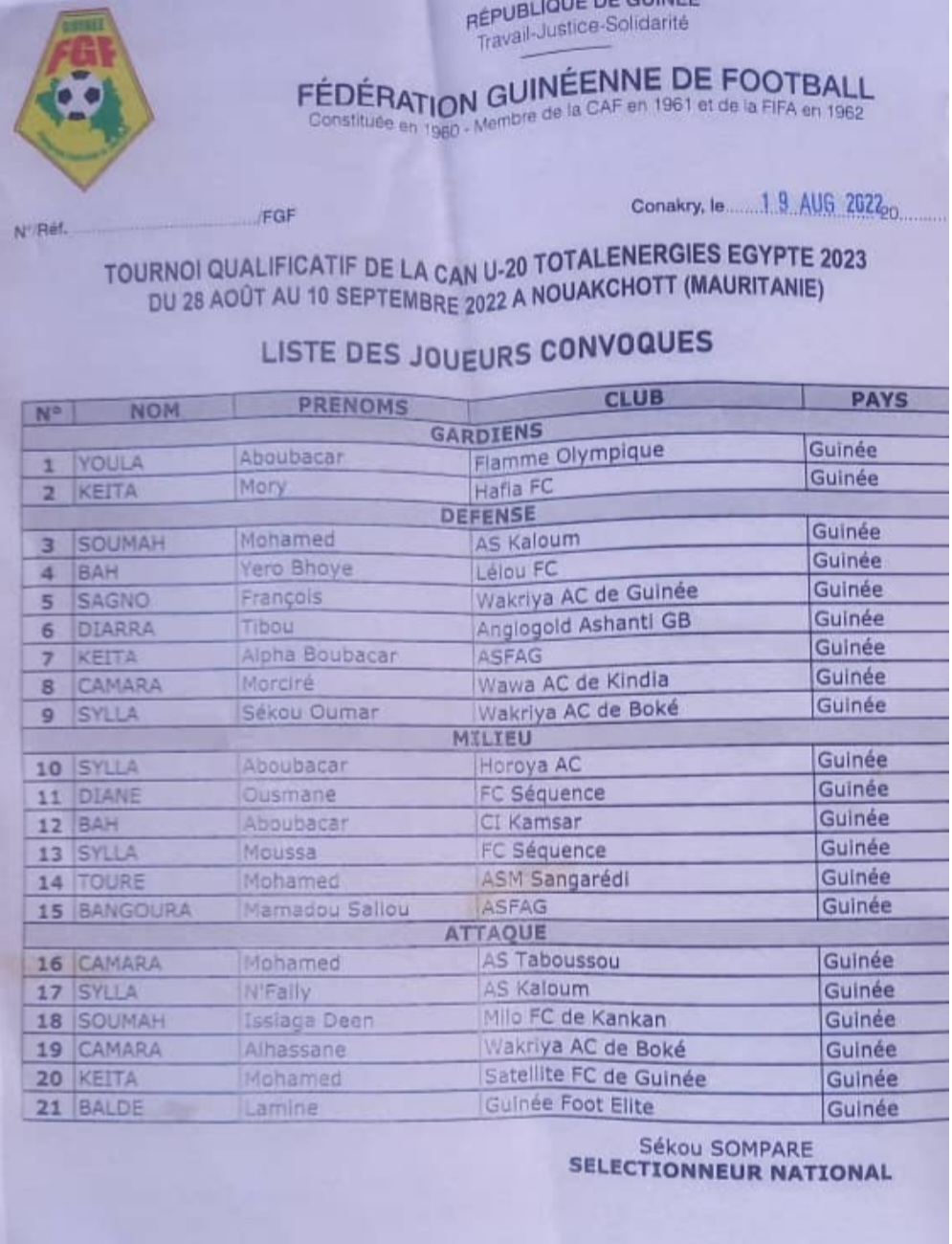 Ce tournoi est qualificatif à la prochaine coupe d’Afrique des moins de 20 ans prévue en 2023 en Égypte. Ce vendredi, le premier responsable de cette équipe du Syli juniors, Sékou Somparé, a publié la liste des 21 joueurs retenus pour cette compétition. On y retrouve 2 gardiens de but, 7 défenseurs, 6 milieux de terrain et 6 attaquants.