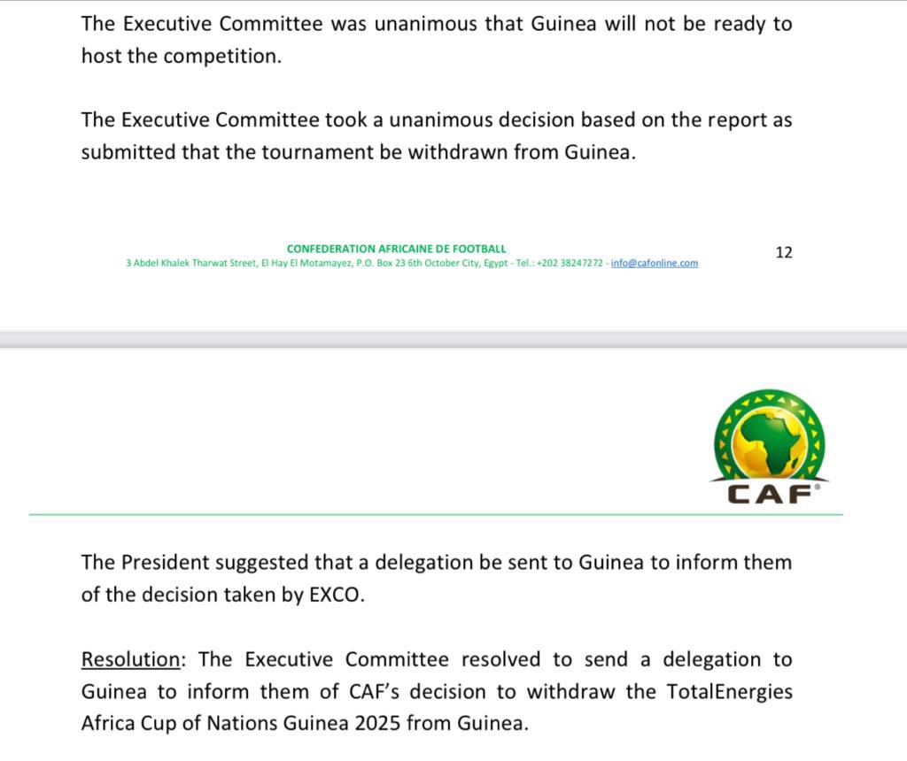 LE CAIRE- Sans une énorme surprise, la Confédération Africaine de football vient d’annoncer le retrait de la coupe d’Afrique des nations 2025 à la Guinée. Une décision prise depuis le 3 juillet dernier si on se contente du mail ci-dessous.