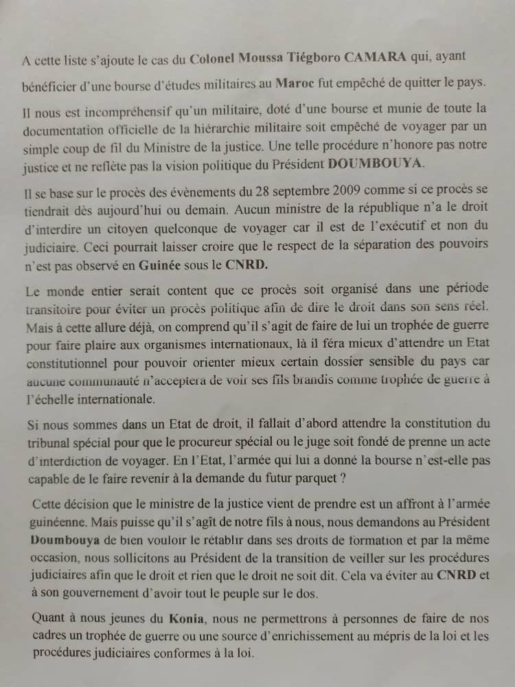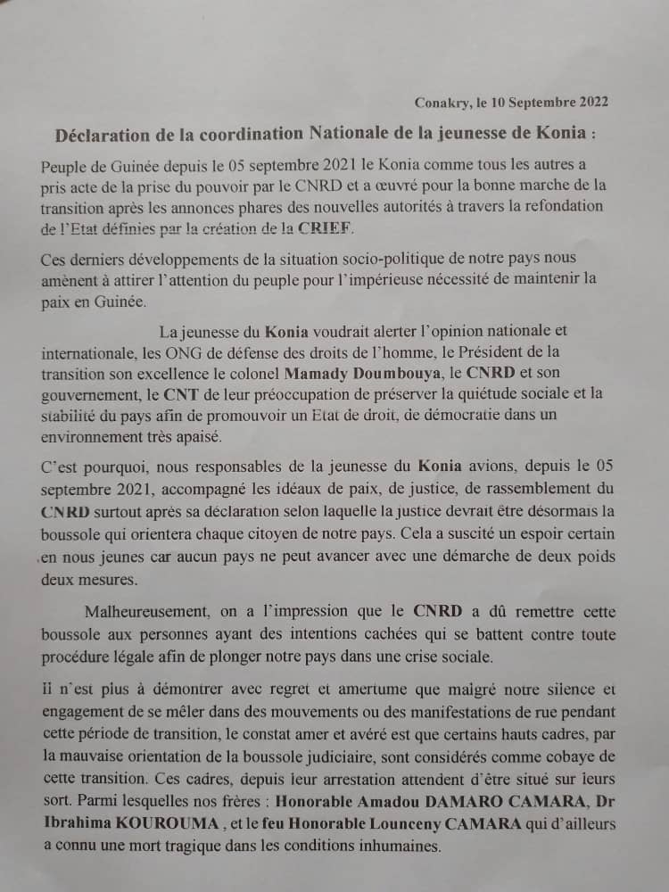 Ci-dessous, ladite déclaration signée du président de la jeunesse du Konia