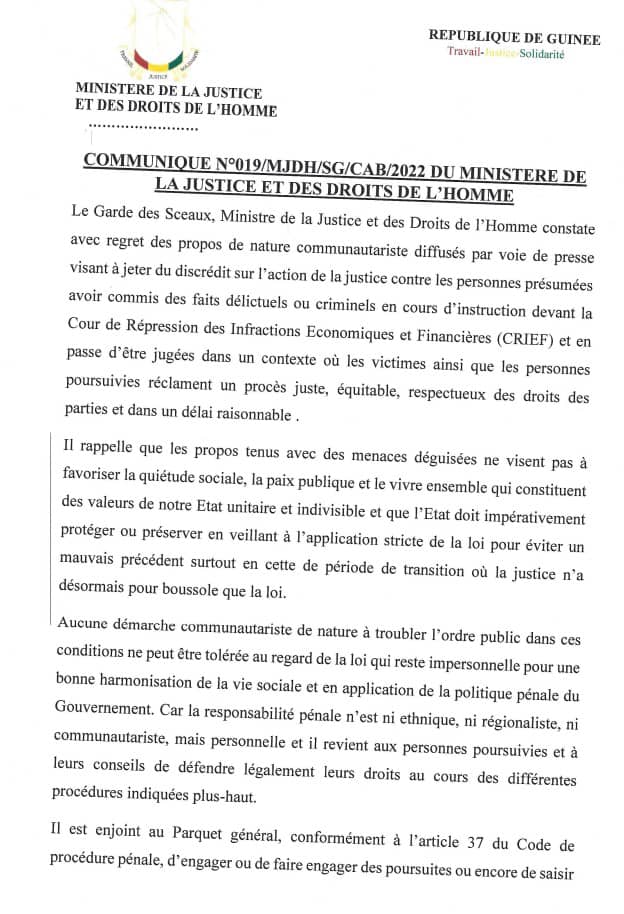 Une déclaration non sans menaces de la coordination nationale de la jeunesse du Konia signée de Ansoumane Damaro Camara provoque l’ire du ministre de la Justice et des droits de l’homme. Alphonse Charles Wright qui a dénoncé avec force les propos contenus dans ladite déclaration a ordonné lundi dans un communiqué au parquet général de traduire devant les juridictions compétentes « les personnes supposées avoir commis ces faits répréhensifs »