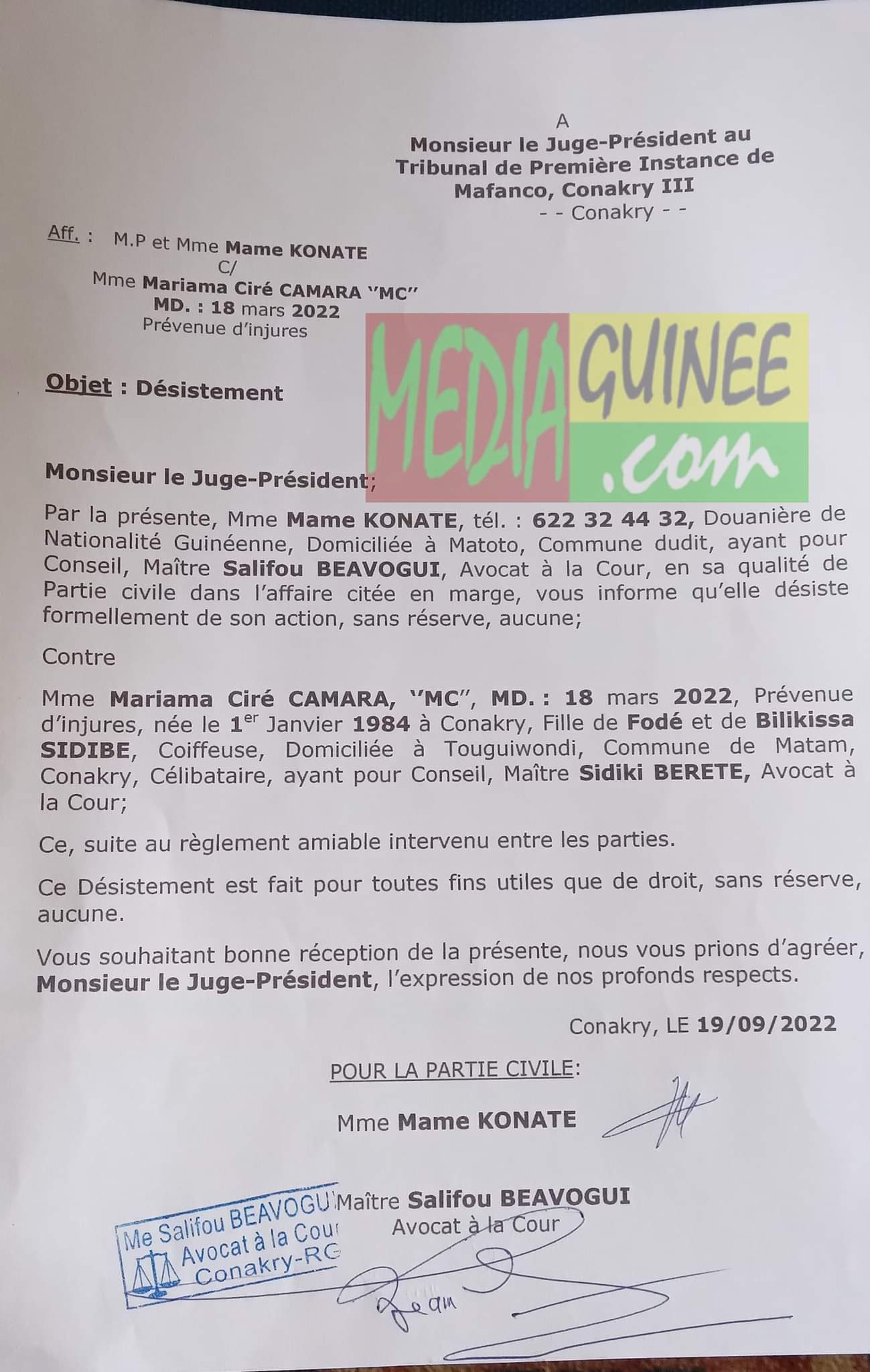 Suite à leur réconciliation scellée hier lundi grâce à l’implication de leurs avocats [Me Sidiki Bérété et Me Salifou Béavogui], la douanière Mame Konaté, épouse du célèbre artiste Ibro Diabaté a adressé, ce mardi 20 septembre une lettre à l’endroit du président du tribunal de première instance de Mafanco pour lui faire part de son désistement vis-à-vis de la vlogueuse, Mariama Ciré Camara (MC).