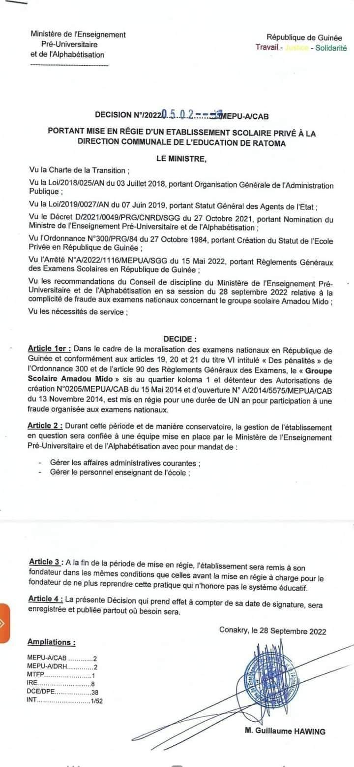 Le ministre justifie sa décision par la participation du Groupe scolaire Amadou Mido à une fraude organisée aux examens nationaux.