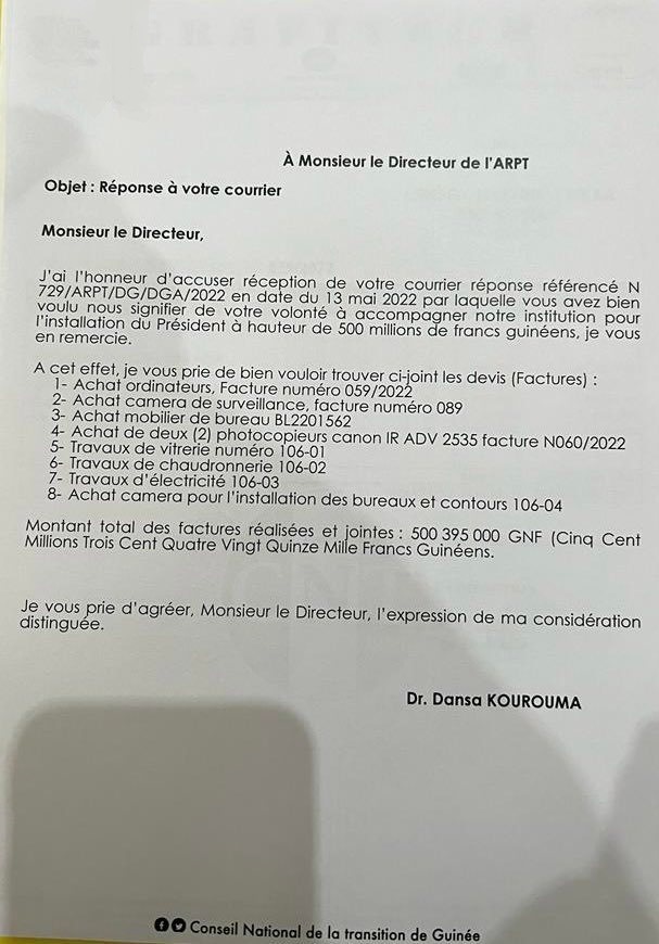 Ecrire aux entreprises publique et parapublique pour leur demander de « soutenir » des actions, on ne peut plus saugrenues, semble être un dada pour Dansa Kourouma, président du CNT. Selon une information révélée à celui-ci sans qu’il ne daigne nous répondre, il a fait payer à des entreprises notamment l’ARPT-voir fac-similé-, son installation à la tête du Conseil national de la transition. Ainsi, l’Autorité de Régulation des Postes et Télécommunication a payé cash 500 millions de GNF qui auraient servi à acheter des ordinateurs, caméras, mobiliers de bureaux, etc.