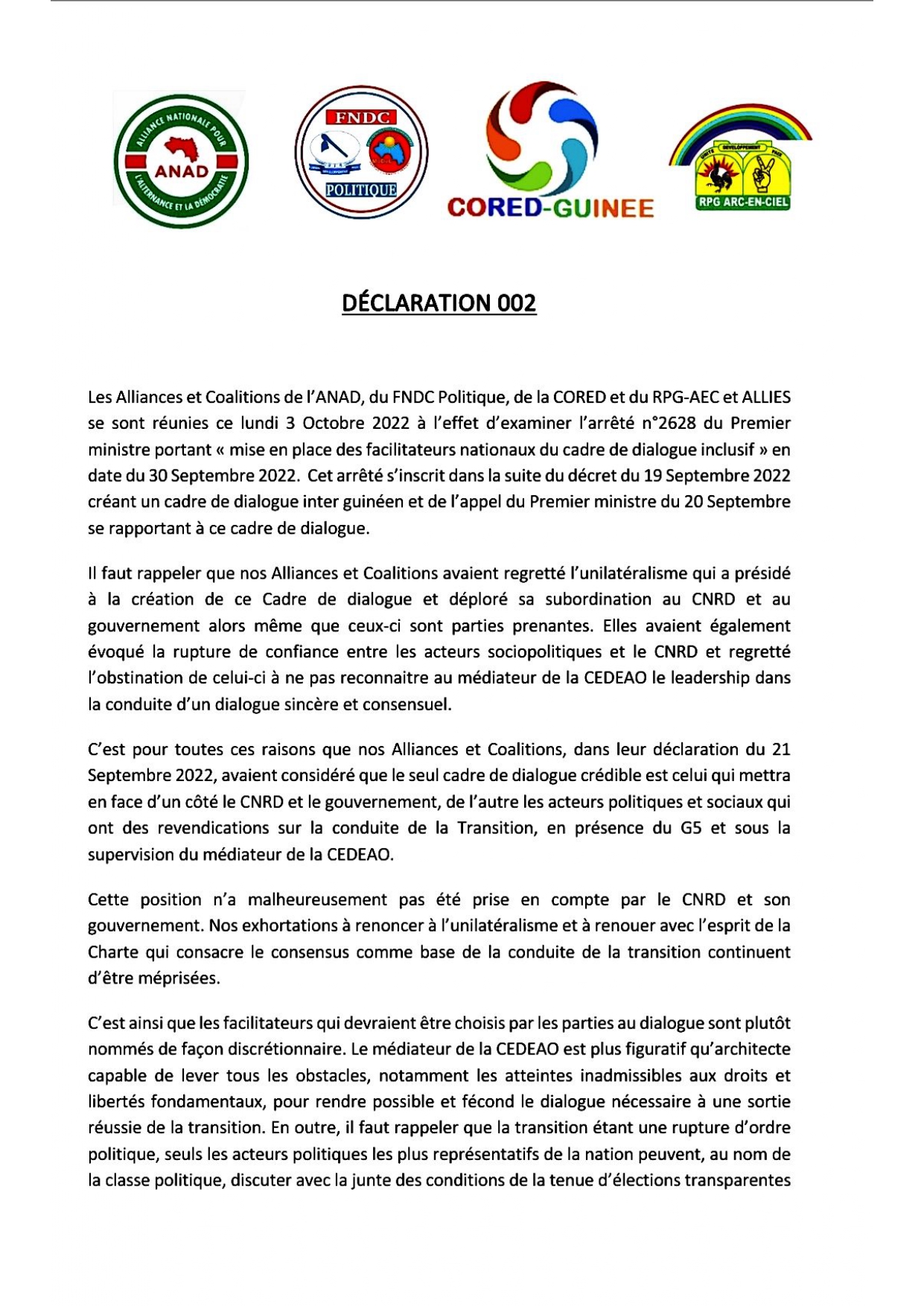 L’arrêté du Premier ministre Dr Bernard Goumou portant mise en place des facilitateurs nationaux du cadre de dialogue inclusif ne passe pas. Les Allainces et coalitions de l’ANAD, du FNDC Politique, de la CORED et du RPG AEC et Alliés ont rejeté lundi, 3 octobre ledit arrêté et rappelé que leurs propositions antérieures n’ont pas été prises en compte. Déclaration
