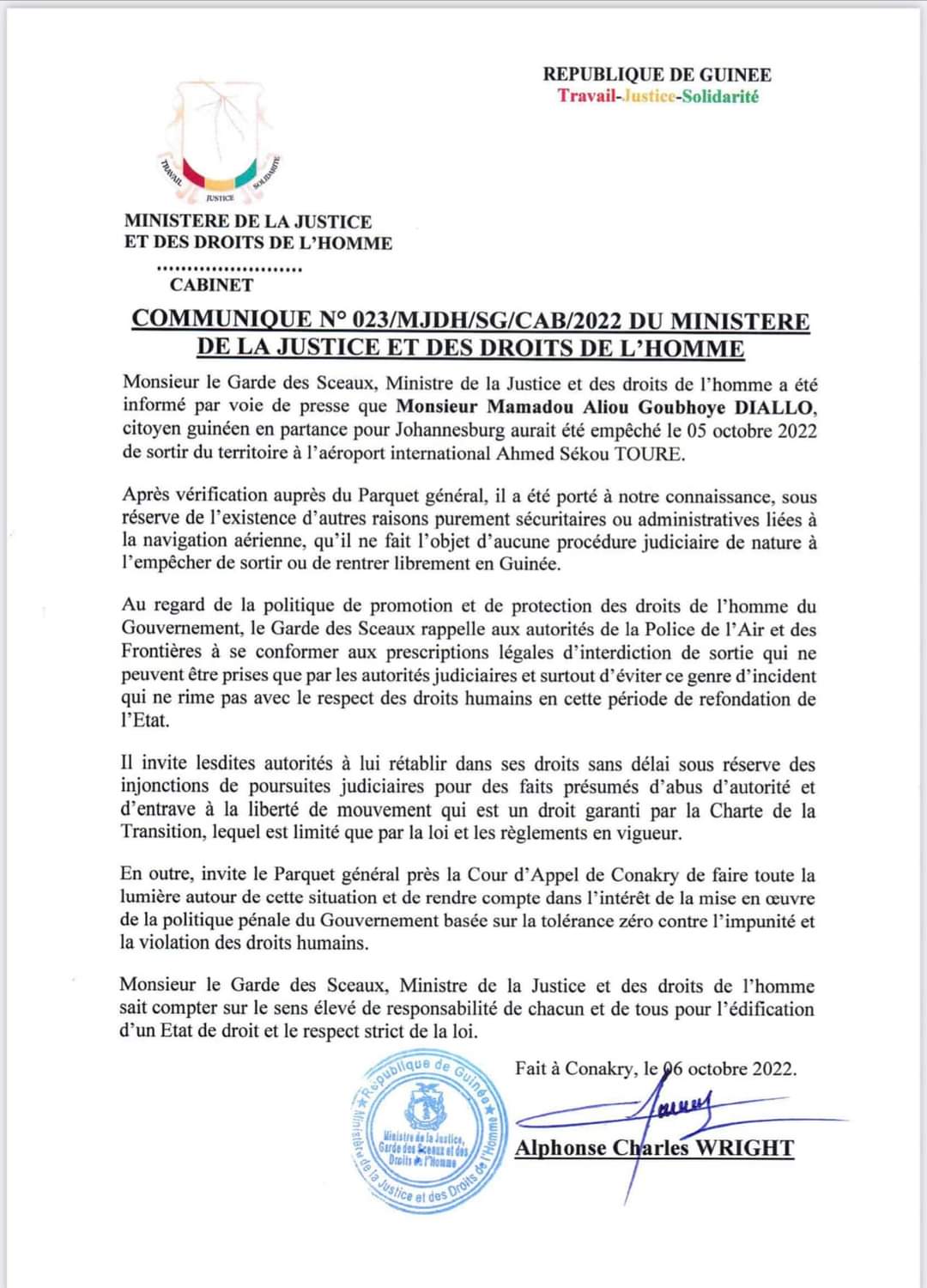 Dans un communiqué dont Mediaguinee détient copie, le ministre de la Justice Alphonse Charles Wright a informé que Mamadou Aliou Goubhoye Diallo qui partait en Afrique du Sud ne fait lobjet d’aucune procédure judiciaire l’empêchant de sortir ou de rentrer librement en Guinée. Rappelant aux autorités de la Police de l’Air et des frontières que seules les autorités judiciaires peuvent prendre une telle décision.