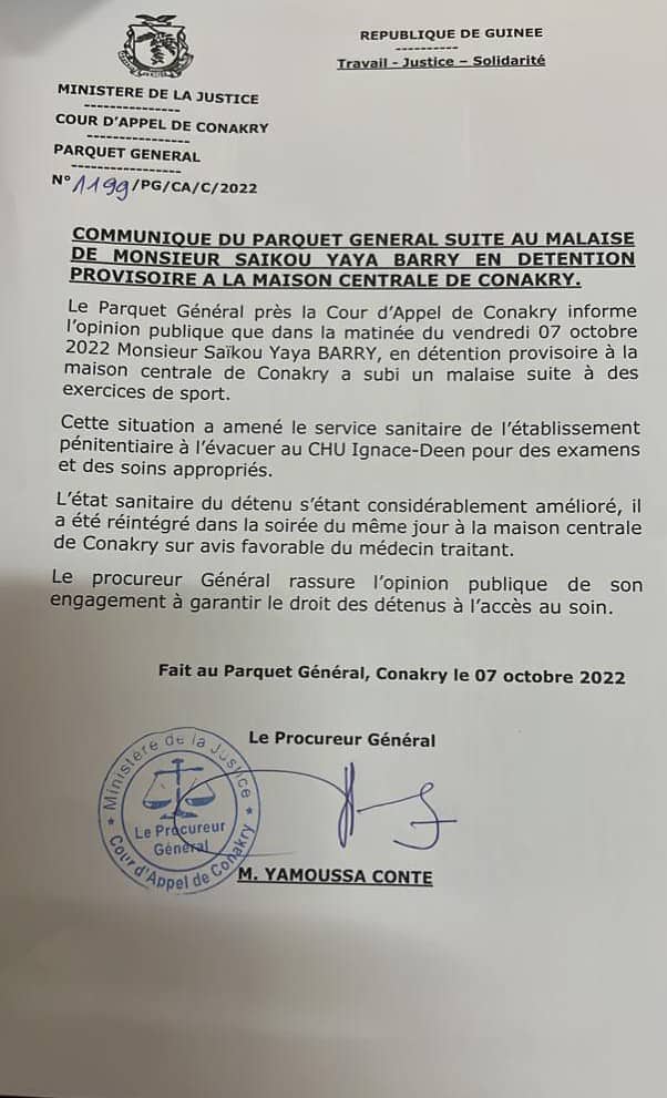 Des communiqués du parquet général près la cour d’appel de Conakry et du ministère de la justice et des droits de l’homme, ont fait état d’un malaise subi ce vendredi par le secrétaire exécutif de l’UFR, Saikou Yaya Barry, en détention à la Maison centrale de Conakry.