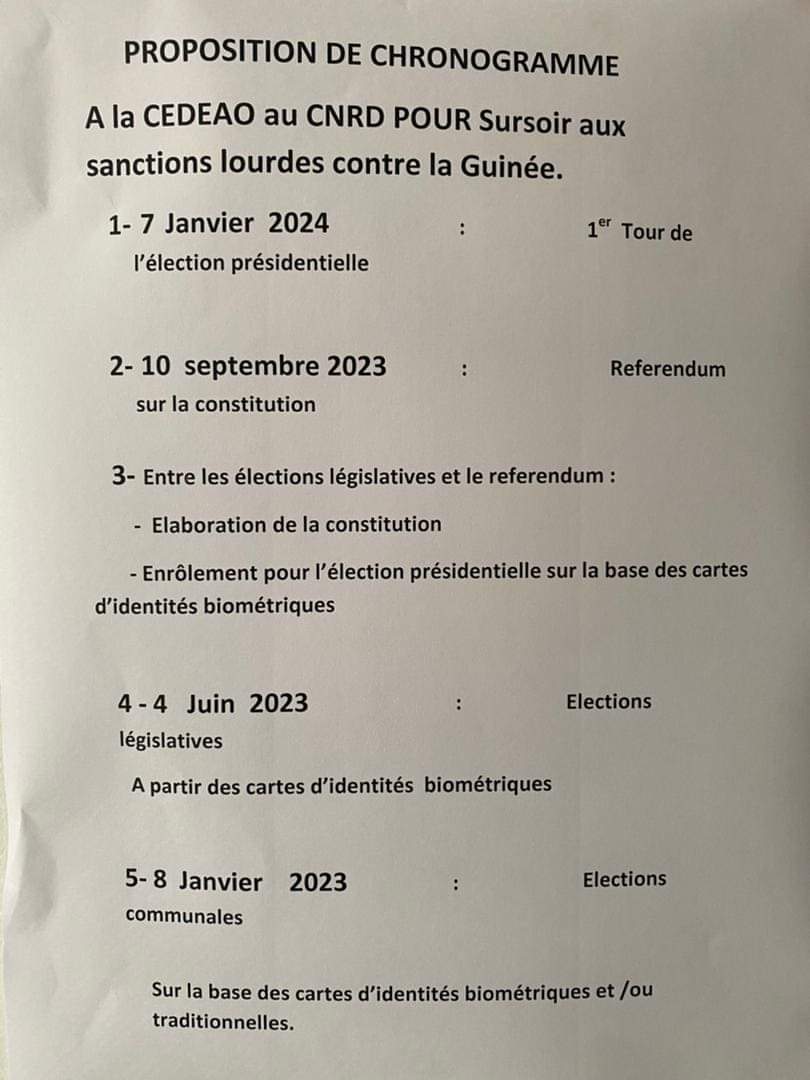 Soucieux du sort de la Guinée qui dépendra nécessairement de la réussite de la transition en cours, Dr Mauro Mandjouf Sidibé, médecin gynécologue et Président du parti Alliance des forces du changement (AFC) (candidat à la dernière élection présidentielle), a fait une proposition de chronogramme à la junte dirigée par le Colonel Mamady Doumbouya et à la CEDEAO pour dit-il sursoir aux lourdes sanctions prises contre la Guinée.