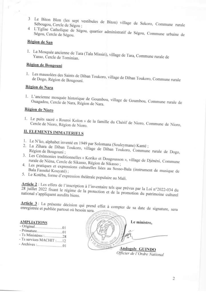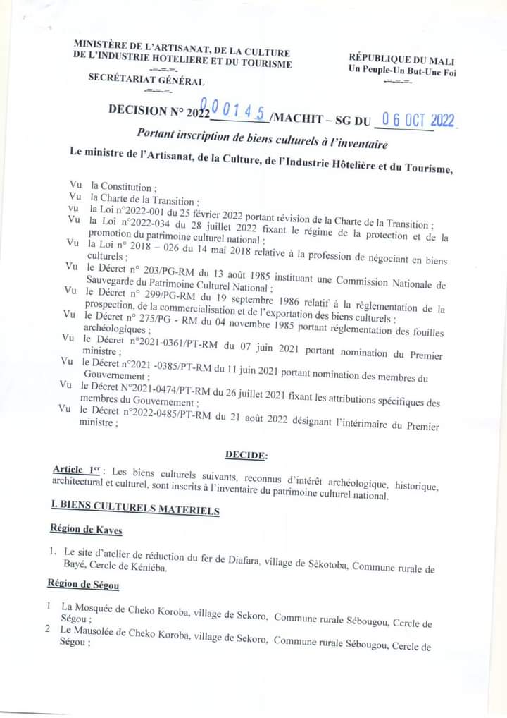Cette décision du ministre Andogoly Guindo vient ainsi élargir la liste considérée étant le patrimoine archéologique, historique, architectural et culturel du Mali.