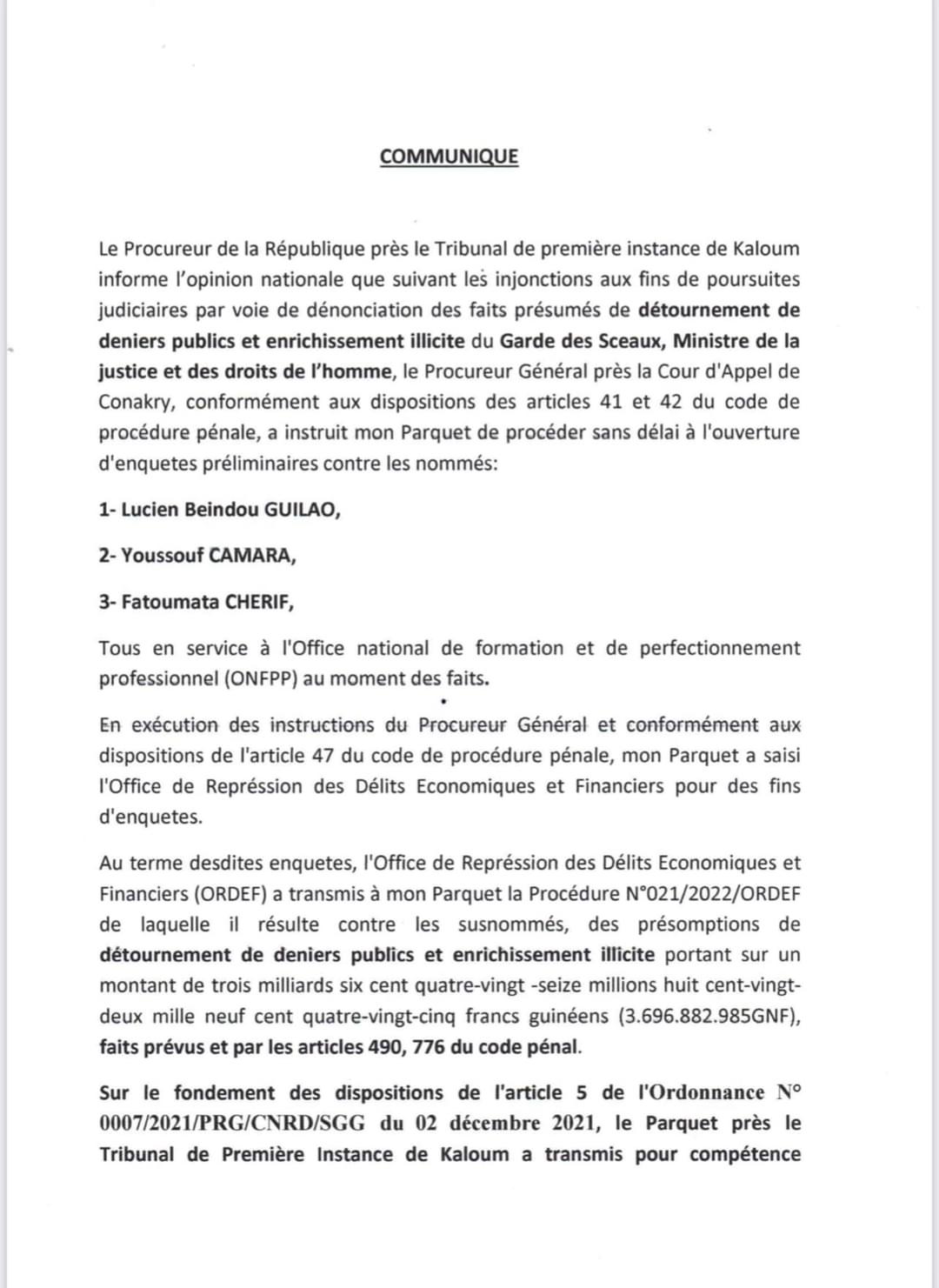 Suite aux injonctions aux fins de poursuite judiciaire du ministre de la Justice faites au procureur général près la Cour d’Appel de Conakry, le procureur de la République près le tribunal de première instance de Kaloum Mamoudou Mafassouba a transmis jeudi à la Crief le dossier de Lucien Guilao, Youssouf Camara et Fatoumata Chérif, tous en service à l’ONFPP pour des présomptions de détournement de deniers publics et enrichissement illicite portant sur un montant de plus de trois milliards de francs guinéens.