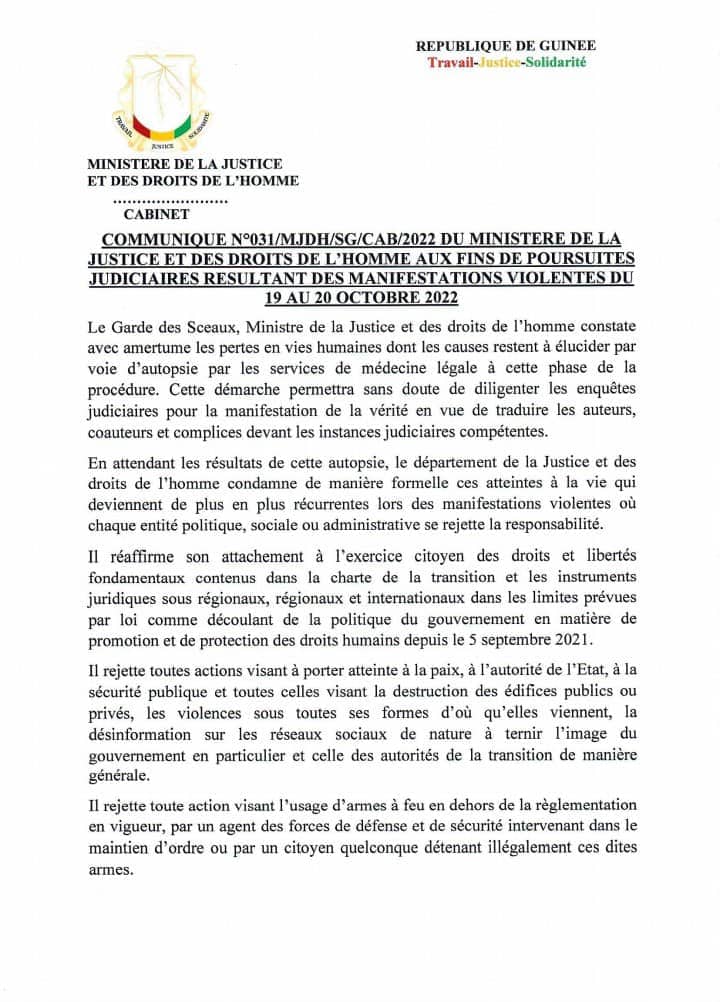 L’article Manifs du FNDC. Le ministre de la Justice reconnait les pertes en vies humaines et ordonne les poursuites… est apparu en premier sur Guinee7.com.