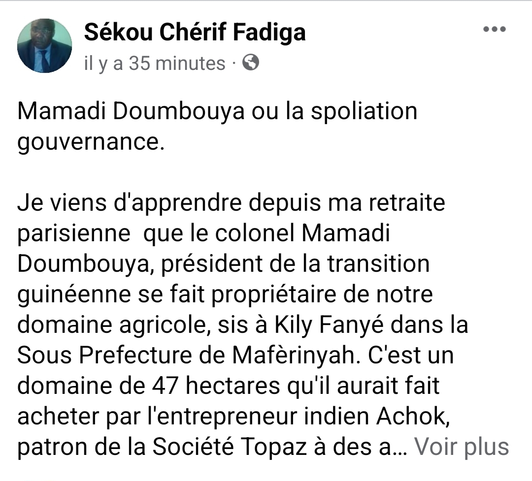 Je viens d’apprendre depuis ma retraite parisienne que le colonel Mamadi Doumbouya, président de la transition guinéenne se fait propriétaire de notre domaine agricole, sis à Kily Fanyé dans la sous-préfecture de Mafèrinyah. C’est un domaine de 47 hectares qu’il aurait fait acheter par l’entrepreneur indien Achok, patron de la Société Topaz à des ayants-droits de notre famille pour un montant de 1.800.000.000 francs sans que nous autres ayants-droits aient été mis au courant. Profitant de la faiblesse de position de nos parents, la Société Topaz s’en fait acquéreur pour ensuite le rétrocéder au colonel Mamadi Doumbouya. C’est pendant mon sejour en Guinée pour les funérailles de ma mère en Mai-juin 2022 que j’ai été mis au courant de la duperie. Sous ma conduite, tous les autres ayants-droits qui sont des centaines de personnes de la famille FADIGA, nous avons engagé des démarches en vue de nous rétablir dans notre droit. Pendant que l’enquête suit son cours, la famille devant se retrouver en conclave pour tirer les choses au clair, j’apprends que Mamadi Doumbouya a commencé à viabiliser le domaine et s’y est rendu ces jours-ci pour superviser les travaux qu’il y a entrepris. J’ai du respect pour la fonction que Mamadi Doumbouya assume à la tête de l’Rtat, mais je ne me laisse pas intimider, même au prix de ma vie. Je n’accepte pas cette spoliation et ne l’accepterai jamais. Je prends à temoin l’opinion publique nationale !