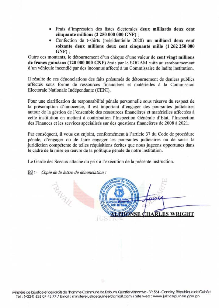 Le ministre de la Justice Alphonse Charles Wright a dans une correspondance adressée mercredi au procureur général près la Cour d’appel de Conakry demandé de poursuivre Kabinet Cissé et Amara Diakité, respectivement ex-president et DAF de la Commission electorale nationale indépendante (Ceni) pour détournement présumé de 400 milliards francs guinéens.