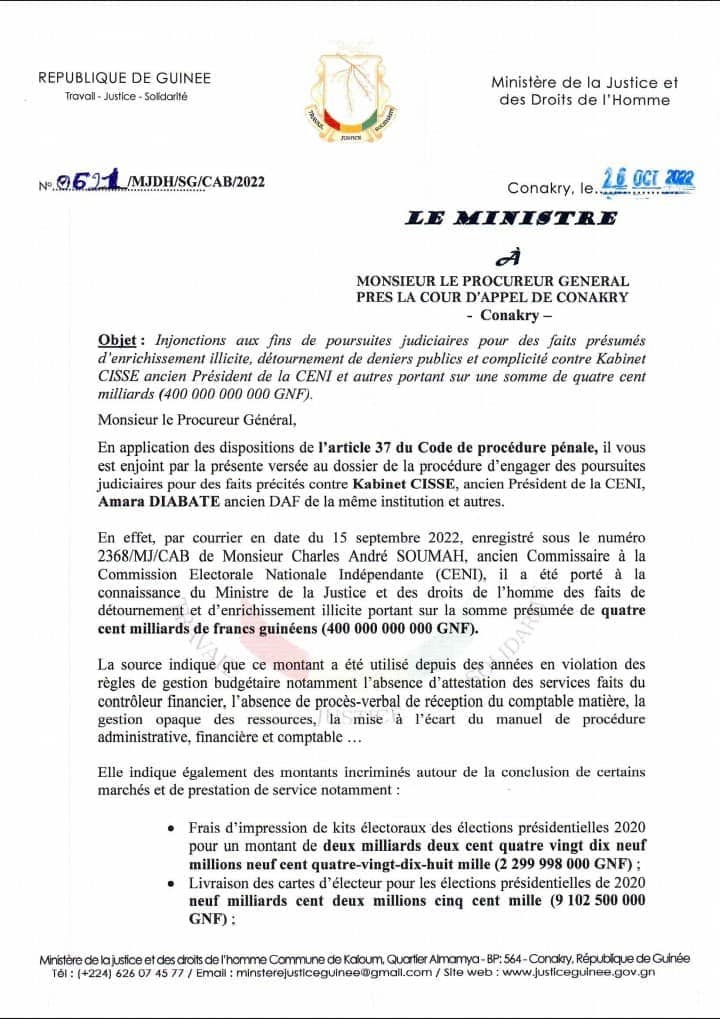 Le ministre de la Justice et des Droits de l’homme, Alphonse Charles Wright, a demandé au procureur général près la cour d’appel de Conakry, d’engager des poursuites judiciaires contre Kabinet Cissé, ancien président de la CENI et Amara Diabaté ancien DAF de la même institution. Il leur reproche des faits présumés d’enrichissement illicite, de détournements de deniers publics et complicité, portant sur la somme de 400 milliards de francs guinéens.