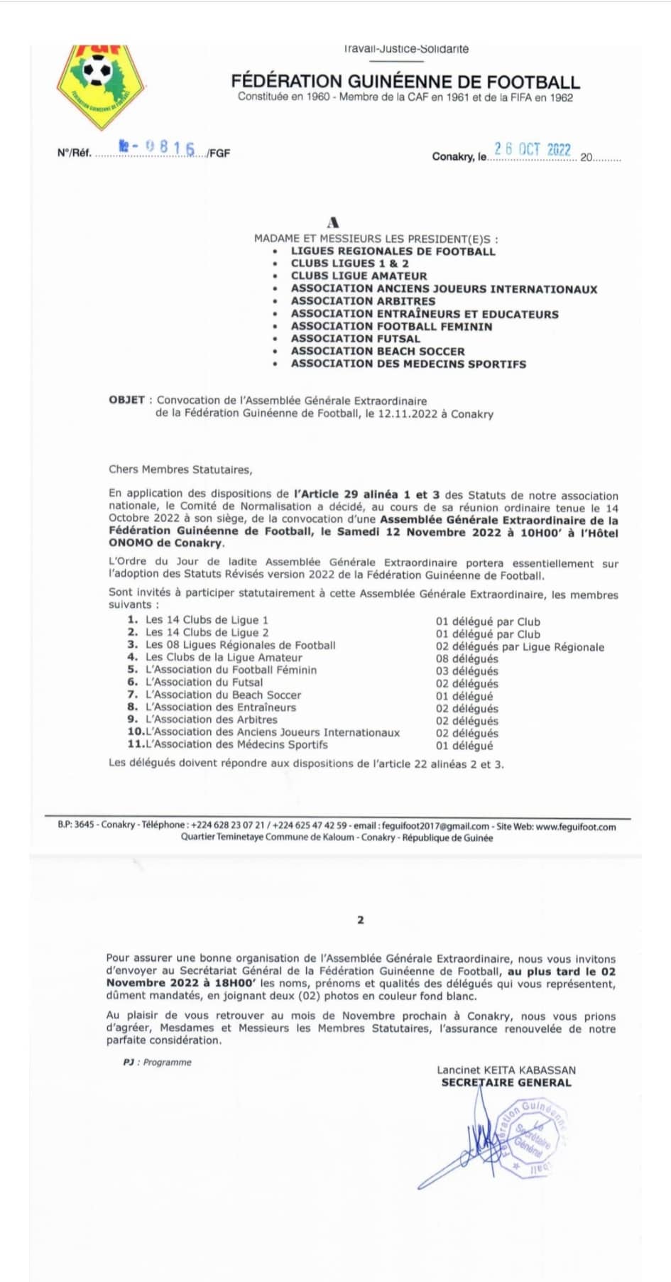 Dans un courrier en date du 26 octobre 2022, adressé aux membres statutaires de la fédération guinéenne de football, le Comité de normalisation, a convoqué une assemblée générale extraordinaire le 12 Novembre 2022 à Conakry, pour l’adoption des statuts révisés.