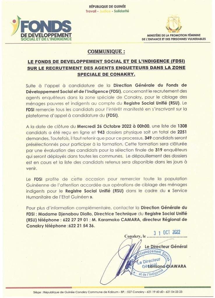 Le fonds de développement social et de l’indigence (FDSI) a dévoilé la liste des demandes pour le recrutement des agents enquêteurs pour le ciblage des ménages pauvres au compte du Registre Social Unifié (RSU) au compte de la zone spéciale de Conakry.