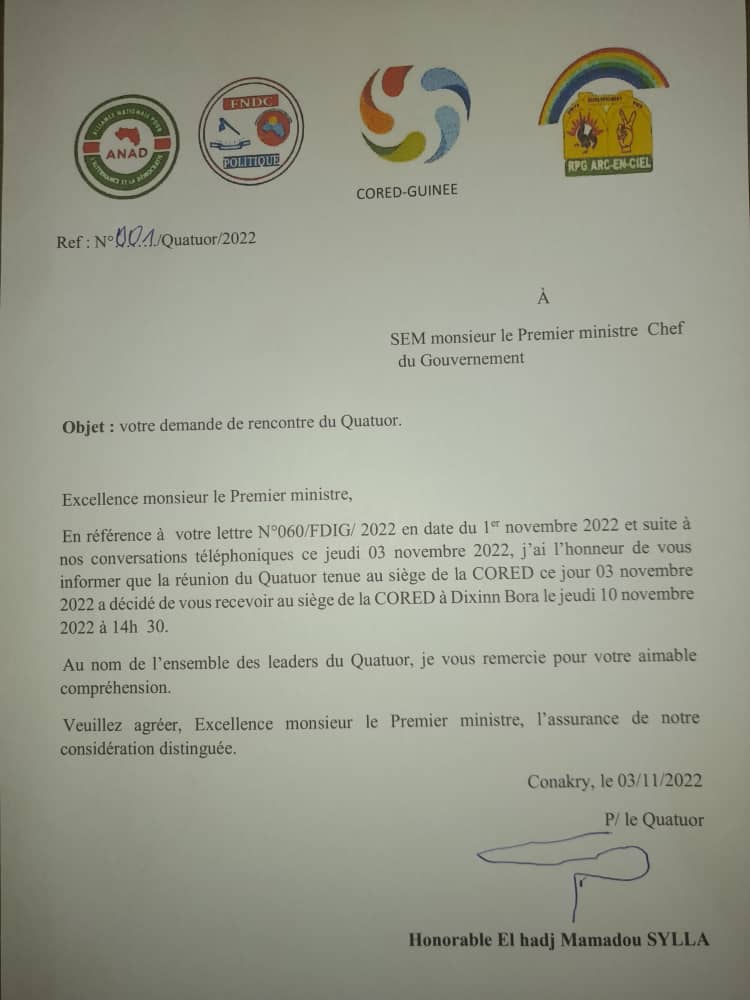 Visiblement, le Quatuor est lentement pressé de recevoir le Premoer ministre Dr Bernard Goumou. Dans une lettre -signée de l’honorable Elhadj Mamadou Sylla- qu’il lui a adressée, le Quatuor dit être prêt à rencontrer le chef du gouvernement le jeudi, 10 novembre prochain à 14h 30 au siège de la CORED.