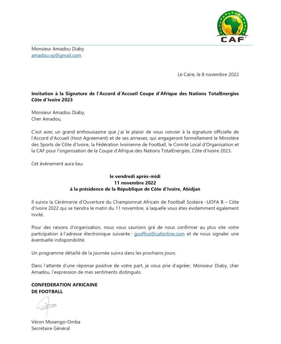 Il s’agit de « l’Accord d’Accueil (Host Agreement) et de ses annexes », qui engageront formellement la Côte d’ivoire à travers le ministère des Sports de Côte d’Ivoire, la Fédération Ivoirienne de Football, le Comité Local d’Organisation et la CAF pour l’organisation de la Coupe d’Afrique des Nations TotalEnergies, Côte d’Ivoire 2023.