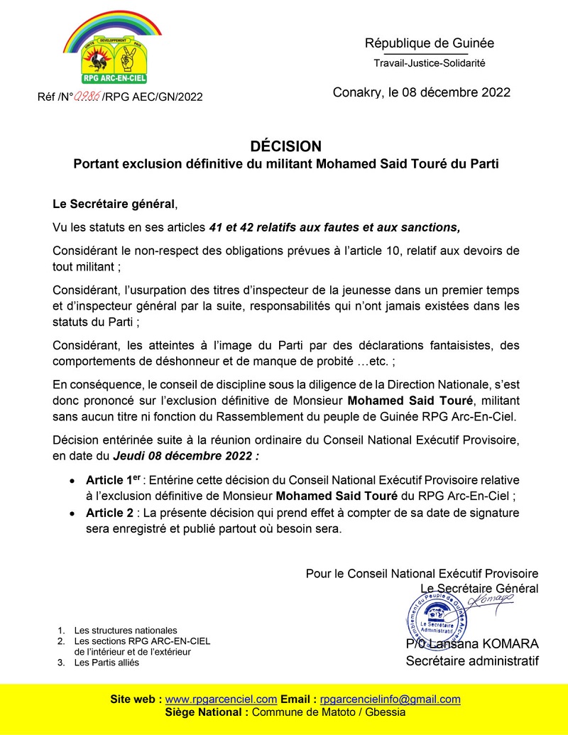Exclu du RPG Arc-en-ciel (voir ci-dessous), le parti d’Alpha Condé, pour « usurpation des titres d’inspecteur de la jeunesse dans un premier temps et d’inspecteur général », nous avons fait réagir Mohamed Said Touré, ce vendredi.