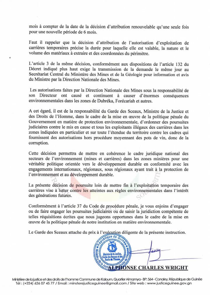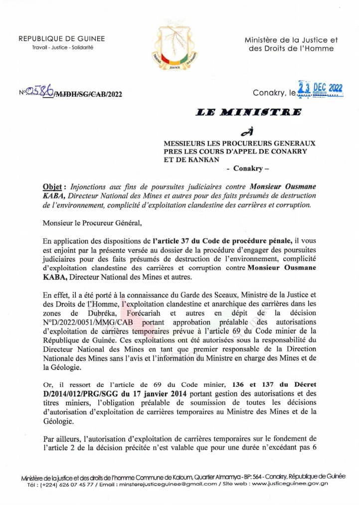 Le ministre de la justice et des droits de l’Homme, informé de « l’exploitation clandestine et anarchique des carrières dans les zones de Dubréka, Forécariah et autres… » a demandé aux juridictions d’engager des poursuites judiciaires contre Ousmane Kaba, directeur national des mines et plusieurs autres cadres, pour des faits présumés de « destruction de l’environnement, complicité d’exploitation clandestine des carrières et corruption. »