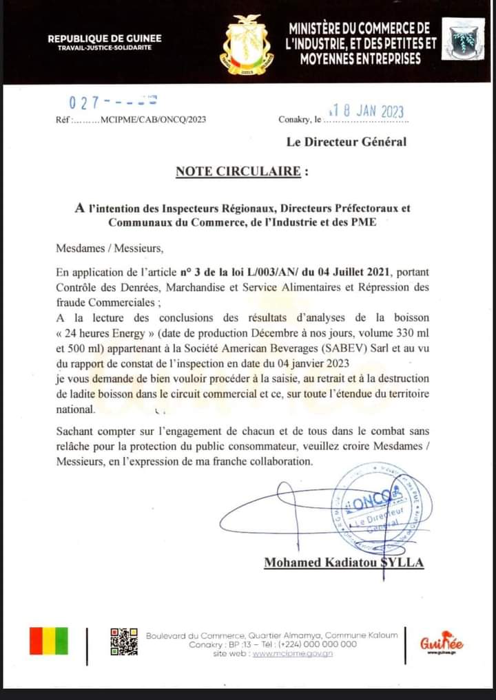 Dans un communiqué, Mohamed Kadiatou Sylla, le directeur national de l’agence nationale de contrôle qualité (ONCQ), a demandé à ses démembrements de procéder à la saisie, au retrait et à la destruction de la boisson 24 heures Energy.