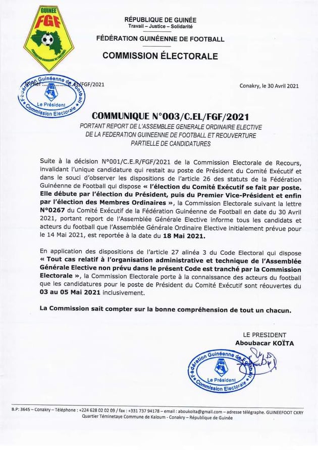 L’assemblée élective de la féguifoot est désormais renvoyée pour le 18 mai 2021. Lire ci-dessous la décision de la commission électorale.