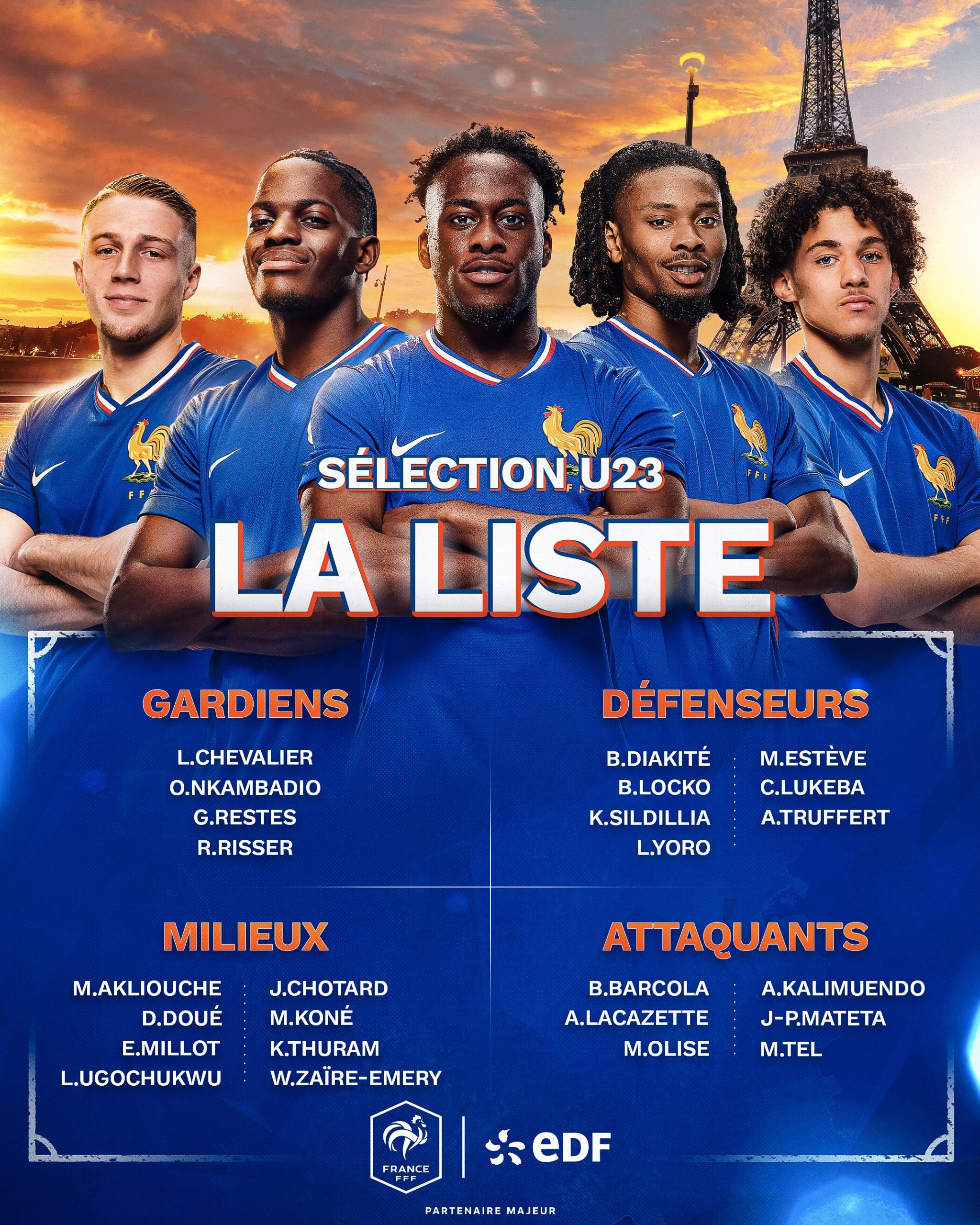 On retrouve le franco-guinéen Bafodé Diakité. Par contre, Mohamed Simakan, longtemps sollicité par le Syli National de Guinée et qui tarde toujours à donner une suite favorable, ne figure pas sur cette liste. L’attaquant Lyonnais Alexandre Lacazette est convoqué, alors que Cherki est le grand absent. Il faut noter que cette liste est encore provisoire, et la France U-23 jouera 3 matchs amicaux avant le début des jeux olympiques.