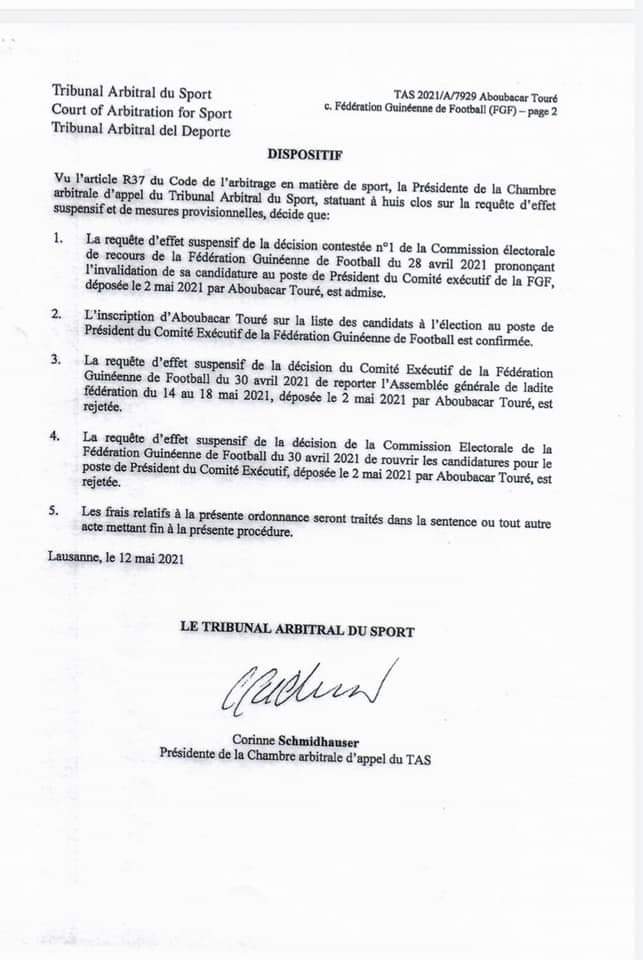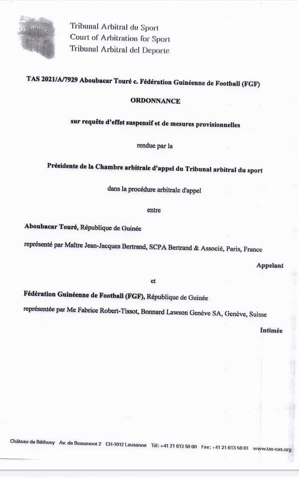 L’article Féguifoot : “l’ordonnance du TAS dit clairement que Aboubacar Touré redevient le candidat unique” (source) est apparu en premier sur Mediaguinee.org.