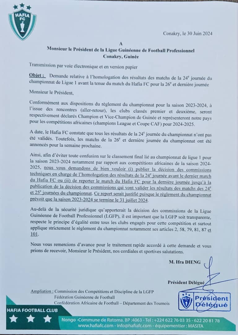 “A date, le Hafia constate que tous les résultats de la 24e journée du championnat n’ont pas été validés. Toutefois, les matchs de la dernière journée ont été annoncés pour la semaine prochaine. Afin d’éviter toute confusion sur le classement final lié au championnat de Ligue 1, notamment par rapport aux compétitions africaines de la saison 2024-2025, nous vous demandons de bien vouloir publier la décision des commissions techniques en charge de l’homologation des résultats de la 24e journée avant le dernier match du Hafia, ou de reporter notre match de la dernière journée jusqu’à la publication de la décision des commissions. Au-delà de la sécurité juridique qu’apporterait la décision des commissions de la Ligue, il est important que la LGFP soit transparente et respecte le principe d’égalité entre tous les clubs engagés pour cette compétition et surtout appliquer strictement le règlement du championnat “ écrit le Hafia.