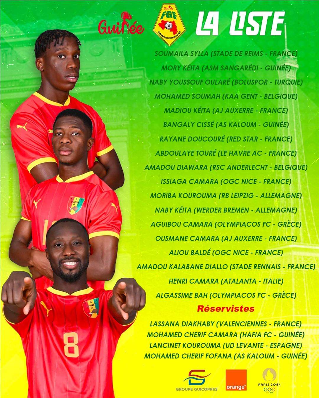 PARIS- Le sélectionneur Kaba Diawara a publié la liste des joueurs retenus pour les Jeux olympiques Paris 2024. Ils sont 18 joueurs plus 4 réservistes convoqués par le sélectionneur guinéen. Sur cette liste, on retrouve Naby Keita, Amadou Diawara et Abdoulaye Touré, coptés en tant que renforts et joueurs âgés de plus de 23 ans, comme l’autorise le règlement.