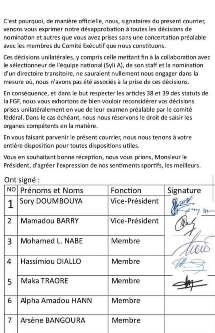 Parmi les décisions incomprises par ces 7 membres se trouve celle du limogeage de Kaba Diawara à la tête du Syli National A et la nomination d’un directoire transitoire. N’étant pas associer, ces membres demandent à Bouba Sampil de reconsidérer ses décisions. Dans le cas échéant, ces derniers n’écartent pas l’idée de saisir les organes compétents en la matière.
